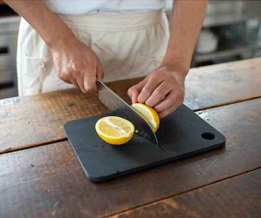 Évitez les abrasifs, les tampons métalliques et l’exposition prolongée à la chaleur ou au soleil, qui pourraient altérer sa surface. Enfin, utilisez toujours des couteaux bien affûtés : ils préservent la planche et assurent une coupe plus précise.