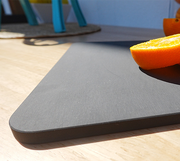 Surface douce pour les couteaux : grâce à un mélange caoutchouc + fibres, la planche offre un toucher plus souple que le plastique dur ; cela ménage le tranchant des lames et aide les couteaux à rester coupants plus longtemps.